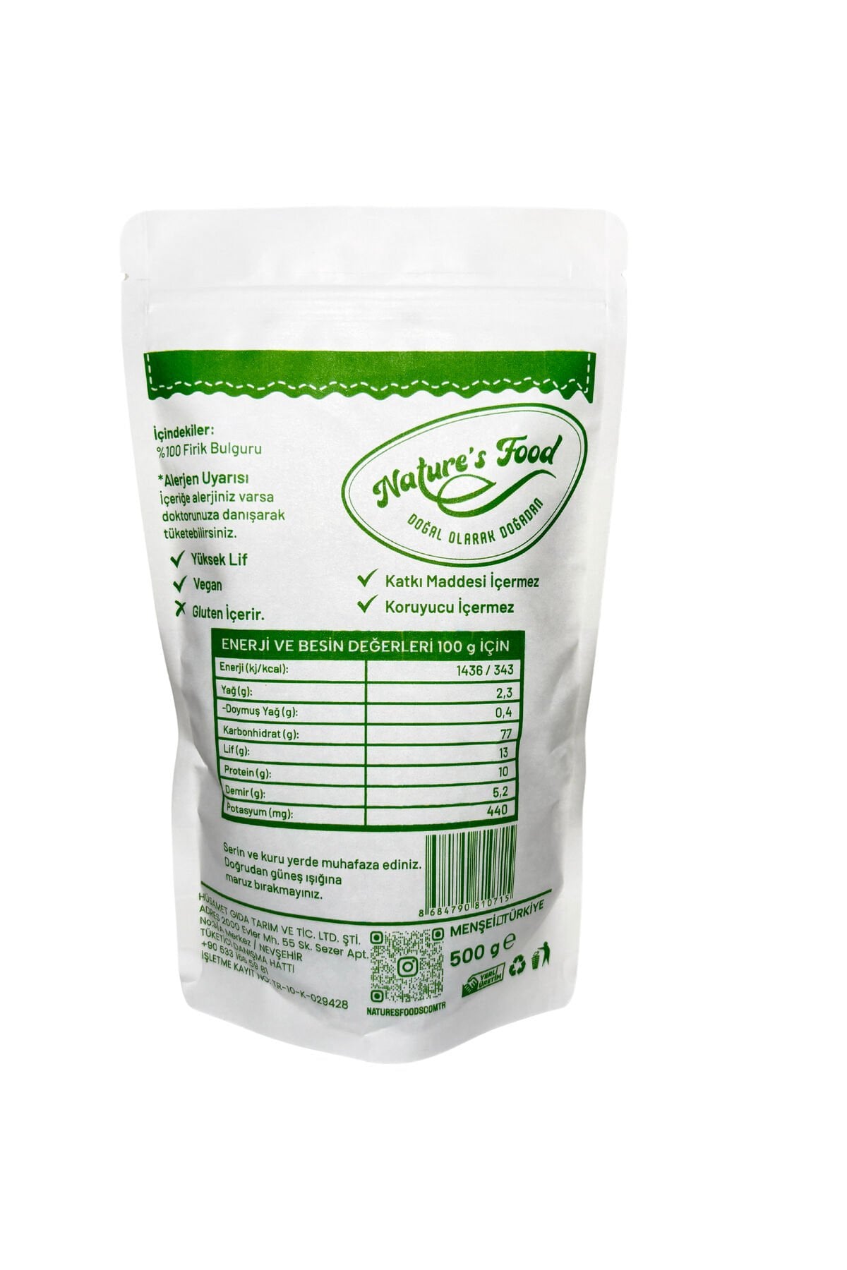 - Yerli üretim: Ürün, Türkiye'de üretilmiş olup yerel kaynaklı malzemeler kullanılarak hazırlanmıştır. - Sağlıklı beslenme: Firik bulgur, doğal lif kaynağı olarak bilinir ve sindirim sistemi sağlığını destekler. - Kolay pişirme: 500 gram ağırlığındaki bu paket, pratik kullanım sunar; tek seferde kolayca servis edilebilir.