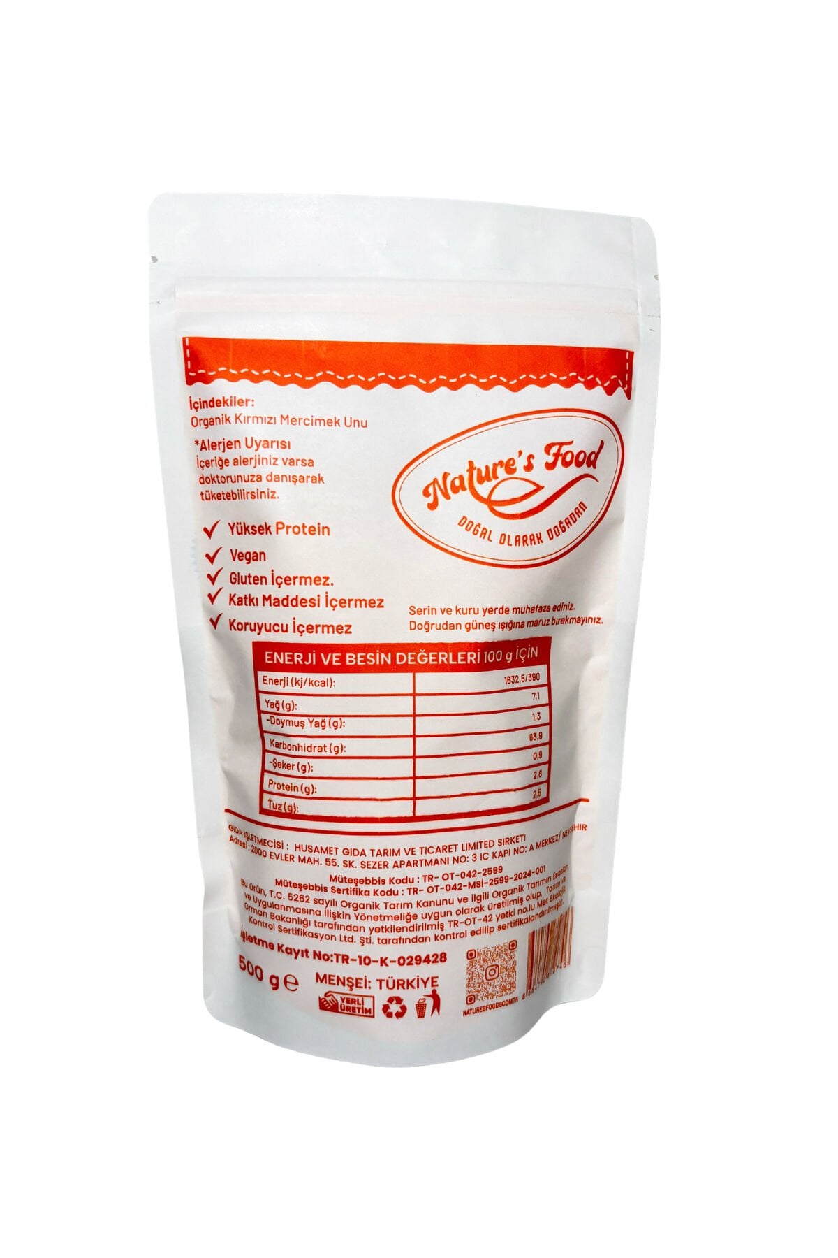 Organik Kırmızı Mercimek Unu 500gr Pestisit Analizli Organik Sertifikalı