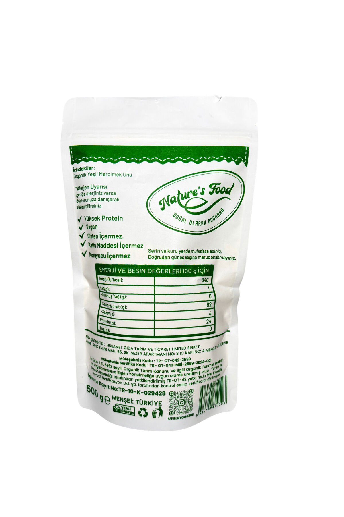 - Organik tarım yöntemleriyle üretilmiş, pestisit analizi yapılmış ve organik sertifikalı yeşil mercimek unu ile sağlıklı beslenmenin keyfini çıkarın.; - 500 gram ağırlığındaki bu un, günlük ihtiyacınız olan protein ve lifi karşılayarak enerjinizi dengede tutmanızı sağlar.; - Menşei Türkiye olan bu ürün, yerel kaynaklardan temin edilerek hem ekonomimize katkı sağlar hem de taze ve kaliteli malzemelerle hazırlanmış lezzetli tariflerin kapınızda olmasını mümkün kılar.